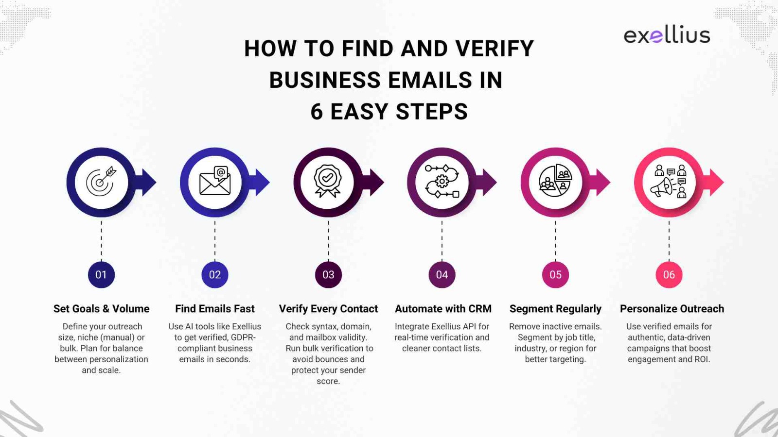 - For high-volume prospecting, use business email finder tools like Exellius that support bulk email verification and discovery.